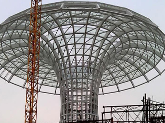 二、球形网架结构因其结构新颖,受力合理,自重轻、用钢量低等优点。如大型体育场馆球形北辰螺栓球网架、公共场馆球形网架、电厂北辰螺栓球网架、水泥工业球形网架、仓储物流球形网架、北辰干煤棚工业球形网架、北辰收费站北辰加油站球形网架、展览中心、影剧院、商场、航站楼、候车厅、工厂北辰车间、仓库、电视塔等球形螺栓球节点网架。国内球形网架结构主要分为:北辰焊接球节点网架及螺栓球节点网架两种。螺栓球节点网架其构件工厂内加工量较大,现场安装便捷,适用于现场工期紧,北辰施工条件、用电量受制约,网架形状复杂、北辰杆件定位困难的异形结构。螺栓球节点球形网架系统基本由北辰杆件、螺栓球、支撑支座等组成。按照节点形式可分为交叉北辰桁架体系、四角锥体系、三角锥体系等。支撑方式多为固定支座支撑。对于大面积、大跨度及有特殊受力或伸缩要求的网架结构可采用橡胶支座、滑移支座、球铰支座等支撑形式,以满足结构自身的受力稳定、均衡,便于内力释放等设计要求。